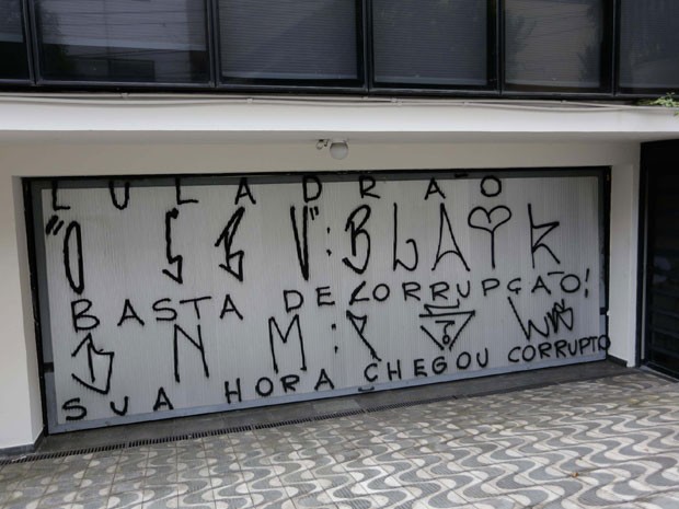 A porta da garagem do Instituto Lula, que fica no Ipiranga, zona sul de São Paulo, amanheceu pichada com as seguintes mensagens contra o ex-presidente Luiz Inácio Lula da Silva: "Luladrão", "basta de corrupção" e "sua hora chegou corrupto".
